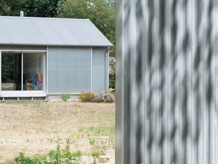 Le principe des grands ouvrants coulissants est également réemployé, accentuant encore l'harmonie entre les deux constructions. Sur chacun des pignons, une baie horizontale redécoupée en six éléments permet d'éclairer naturellement l'intérieur du garage. Le format de ces baies rappelle celles du cabanon en bois existant, et fait le lien avec cette troisième construction présente sur le terrain.