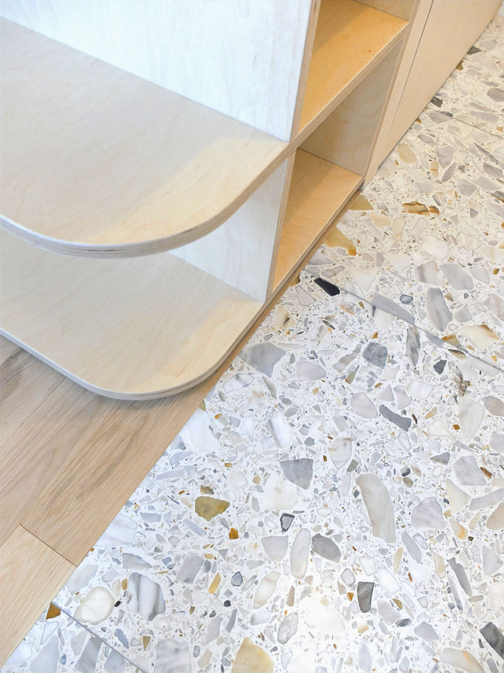 Suivant un cahier des charges précis, l'enjeu est ici de créer un espace de vie qui permette également une configuration propice au travail à domicile. L'espace se retrouve alors structuré par ce double enjeu d'usage aux temporalités distinctes. La mise en forme de cette contrainte d'usages s'est traduite par la création d'un grand ensemble menuisé structurant l'espace. Un mur étagère perméable organise les rapports entre la cuisine et le séjour tandis qu'un long meuble filant vient permettre le travail aussi bien dans le séjour que dans la chambre tout en permettant de profiter des vues offertes par la localisation de l'appartement.